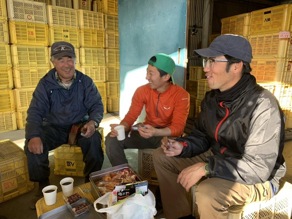 当農園は約3.5ヘクタールの面積でみかんを作っています。これからの時期は10名体制で作業にあたります。休憩時間はみんなでお菓子を食べたり、飲み物を飲んで和やかに過ごしています。