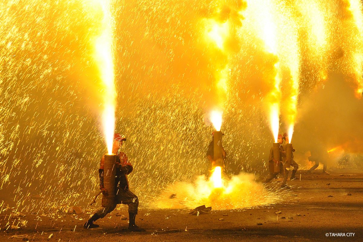祭りのフィナーレを飾る花火大会。吹き上がる火の粉が勇壮な手筒花火