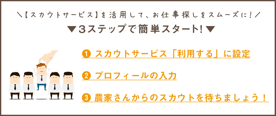 プロフィール及び経歴・自己PRを入力していただくことで、サービスを受けられるようになります。農業は、経験が無くてもいい求人が多いのが特徴です。大事なのは、なぜ農業がしたいのか、どのような働き方をしたいのかというあなたの“思い”です。「この人をスカウトしたい!」と思われるメッセージをぜひご入力ください。