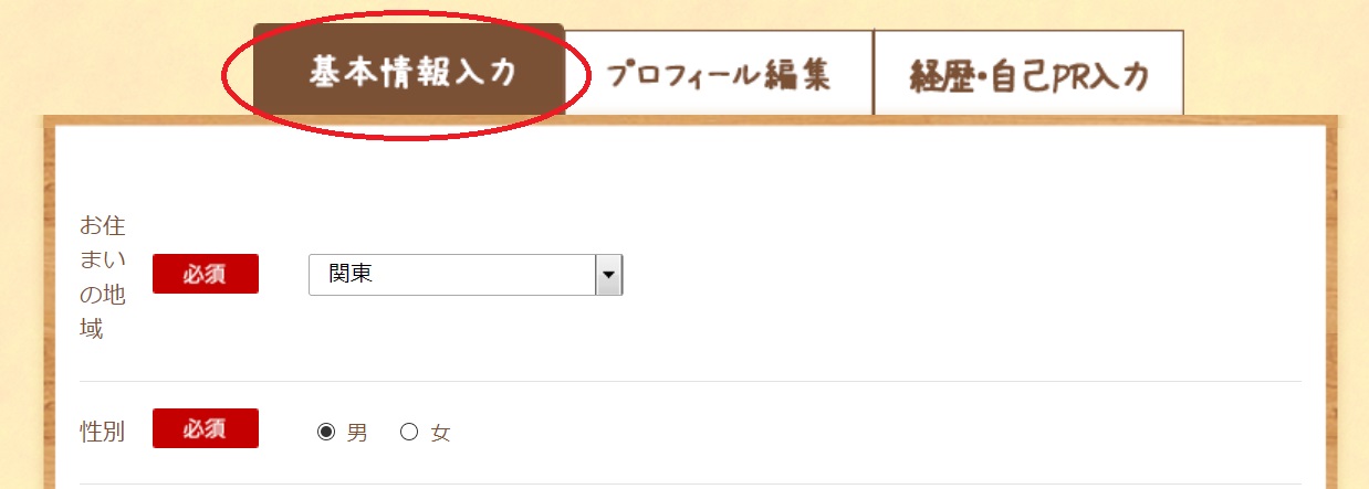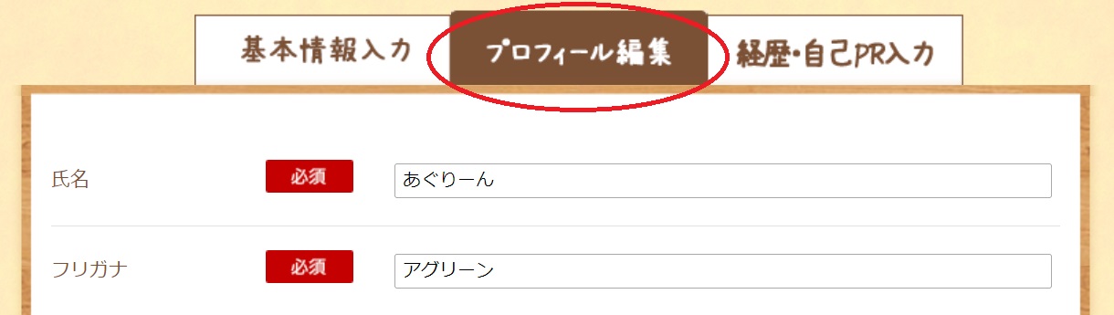 3.プロフィール編集メニューのタブを切り替え、「プロフィール」をご入力ください