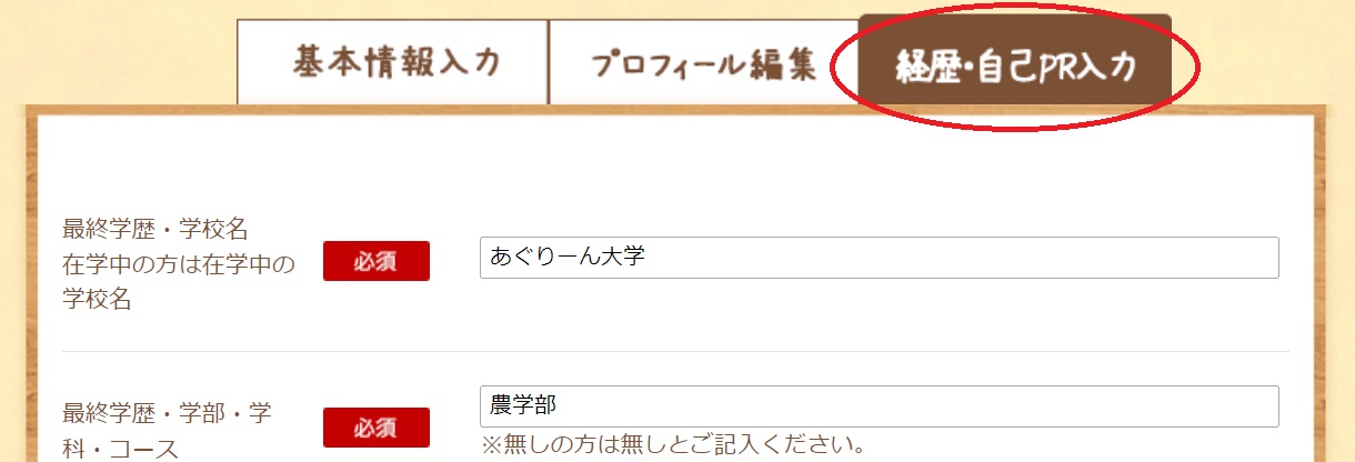 4.最後に、プロフィール編集メニューのタブを切り替え、「経歴・自己PR」をご入力ください