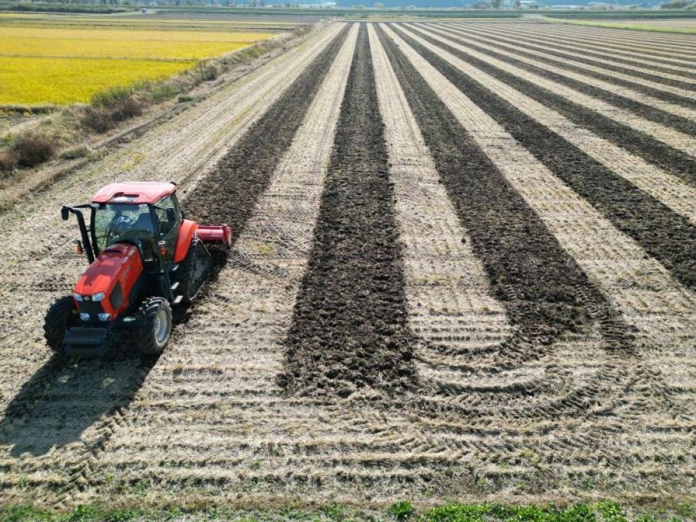 効率化した広い田んぼで、大型トラクターやドローンを駆使する。効率化を突き詰めることで、より生産性の高い「攻めの農業」を実現しています。