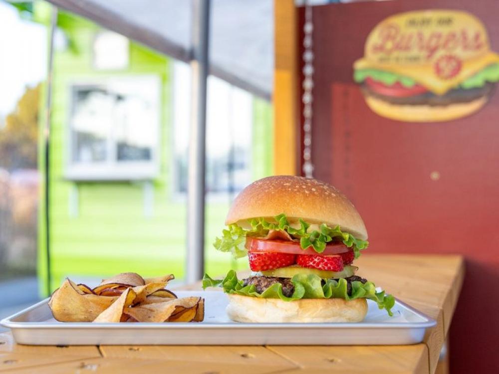 2025年12月から始めたハンバーガー。パン工房で焼き上げたオリジナルバンズに和牛100%のパテ、2種類のオリジナルソース、そして農家ならではのスペシャルトッピング!イチゴ、ブルーベリー、パイナップルをご用意しましたカフェ内、イートインで食べるも良し、テイクアウトもOK!