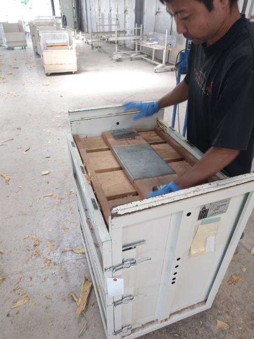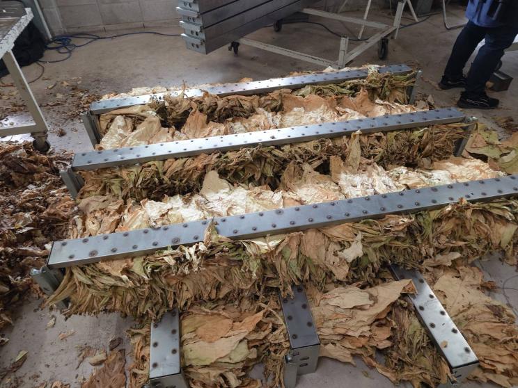 乾燥した葉たばこを、箱詰めしている様子です。葉っぱが入った箱は30キロ近くの重さになりますので、力自慢な方にお手伝いいただけると助かります。