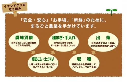 イオンアグリ創造(株)が提供する農作物は、生産から店頭までイオンが一貫して責任をもって管理する、プライベートブランドです。私たちは、安全・安心で、新鮮で美味しく、合理的な価格を実現する生鮮食品のプライベートブランドを安定的に提供することで、お客さま満足の向上を目指します。