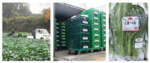 農場から出荷した農産物は、イオンの物流網を使い物流センターや加工センターを経由して最短で翌朝にはイオンの店舗にお届けしています。小松菜などの袋には包装日を記載して、新鮮さと正確な情報をお客さまにお伝えしています。