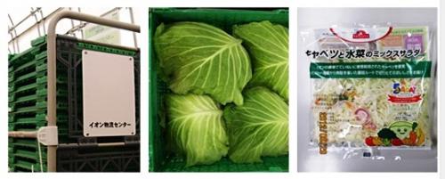 ○集荷にはイオンの店舗に荷物を降ろしたトラックの帰り便を利用する。青果向けに加えて、カット野菜や加工製品の材料など、畑の収穫物を余すことなく商品化する。